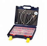 Тестер топливной системы впрыска. Позволяет диагностировать абсолютно любые топливные системы впрыска автомобилей (Европа, Россия, Азия, Америка и т.д.) и находить неисправный элемент методом измерения давления. Достоинством является высокоточный манометр, диаметром 63 мм, с ценой деления 0,1 BAR. В комплекте порядка 80 адаптеров.