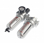 Регулятор давления воздуха с лубрикатором, влагоотделителем и манометром 1/4”. Пропускная способность – 1500л/мин. Давление компрессора 0-10Бар. Снижает давление между компрессором и пневмоинструментом.