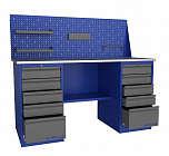 Двухтумбовый. Допустимая нагрузка на столешницу 1000 кг. Опорные элементы выполнены сварными из холоднокатаной стали. Для выполнения сборочных, ремонтных, слесарных, монтажных и других видов работ на производстве, в сервисных центрах, мастерских, гаражах, а также для обучения технологии в учебных заведениях. Комплектуется полкой-стенкой, расположенной под столешницей для удобного размещения габаритного инструмента и оснастки. Размеры верстака: 855x1596x696 мм. Вес: 98 кг. Поставляется в 4 комплектациях на выбор.