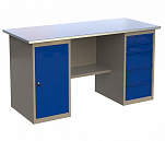 Двухтумбовый. Допустимая нагрузка на столешницу 1000 кг. Опорные элементы выполнены сварными из холоднокатаной стали. Для выполнения сборочных, ремонтных, слесарных, монтажных и других видов работ на производстве, в сервисных центрах, мастерских, гаражах, а также для обучения технологии в учебных заведениях. Комплектуется полкой-стенкой, расположенной под столешницей для удобного размещения габаритного инструмента и оснастки. Размеры верстака: 855x1596x696 мм. Вес: 108 кг. Поставляется в 4 комплектациях на выбор.