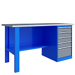 Однотумбовый. Допустимая нагрузка на столешницу 750 кг. Опорные элементы выполнены сварными из холоднокатаной стали. Верстак состоит из столешницы, опоры, тумбы P5 с четырьмя малыми и одним большим ящиком и полки-стенки. Все металлические элементы покрыты полиэфирной порошковой краской. Столешница состоит из фанеры марки ФСФ толщиной 24 мм, которая покрыта лаком-антисептиком и листом оцинкованной холоднокатаной стали толщиной 1,2 мм. Размеры (ВхШхГ) 855x1396x696 мм.