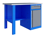 Однотумбовый. Допустимая нагрузка на столешницу 750 кг. Опорные элементы выполнены сварными из холоднокатаной стали. Верстак состоит из столешницы, опоры, тумбы P8 с малым ящиком и отделением с дверью и одной полкой, полки-стенки и одинарного экрана с кронштейнами. Все металлические элементы покрыты полиэфирной порошковой краской. Столешница состоит из фанеры марки ФСФ толщиной 24 мм, которая покрыта лаком-антисептиком и листом оцинкованной холоднокатаной стали толщиной 1,2 мм. Размеры (ВхШхГ) 1470x1196x696 мм.