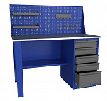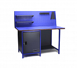 Однотумбовый. Допустимая нагрузка на столешницу 750 кг. Опорные элементы выполнены сварными из холоднокатаной стали. Верстак состоит из столешницы, опоры, тумбы P5 с четырьмя малыми и одним большим ящиком, полки-стенки, двойного экрана с кронштейнами. Столешница состоит из фанеры марки ФСФ толщиной 24 мм, которая покрыта лаком-антисептиком и листом оцинкованной холоднокатаной стали толщиной 1,2 мм. Размеры (ВхШхГ) 1965x1396x696 мм.