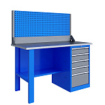 Однотумбовый. Допустимая нагрузка на столешницу 750 кг. Опорные элементы выполнены сварными из холоднокатаной стали. Верстак состоит из столешницы, опоры, тумбы P5 с четырьмя малыми и одним большим ящиком и полки-стенки. Все металлические элементы покрыты полиэфирной порошковой краской. Столешница состоит из фанеры марки ФСФ толщиной 24 мм, которая покрыта лаком-антисептиком и листом оцинкованной холоднокатаной стали толщиной 1,2 мм. Размеры (ВхШхГ) 855x1396x696 мм.