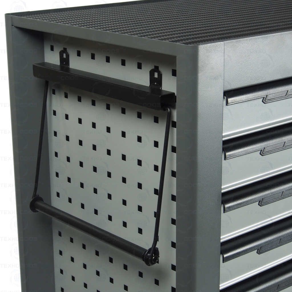 • Перфорированные внутренние стенки боковых ящиков с квадратными отверстиями предоставляют возможность разместить дополнительные аксессуары для хранения инструментов. Применяется с серией подвесных приспособлений JTC-3218.