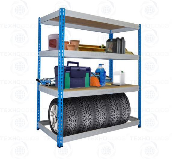 Стеллажи полочные, сборно-разборные. Особенности конструктивного исполнения стеллажа позволяют производить сборку без дополнительных крепежных элементов. А профиль балки МКФ позволяет использовать стеллаж в 2-х вариантах: одна сторона предназначена для настила, другая – для хранения автомобильных колес. В 1-м варианте каждая полка (ярус) состоит из продольных и поперечных) балок, на которых размещается усиленная фанера, во 2-м – только продольные и поперечные балки. Балки стеллажа крепятся к стойкам при помощи двух замков с зацепами. Стеллажи с представленными размерами позволяют хранить колеса радиусом от 15” и выше.
