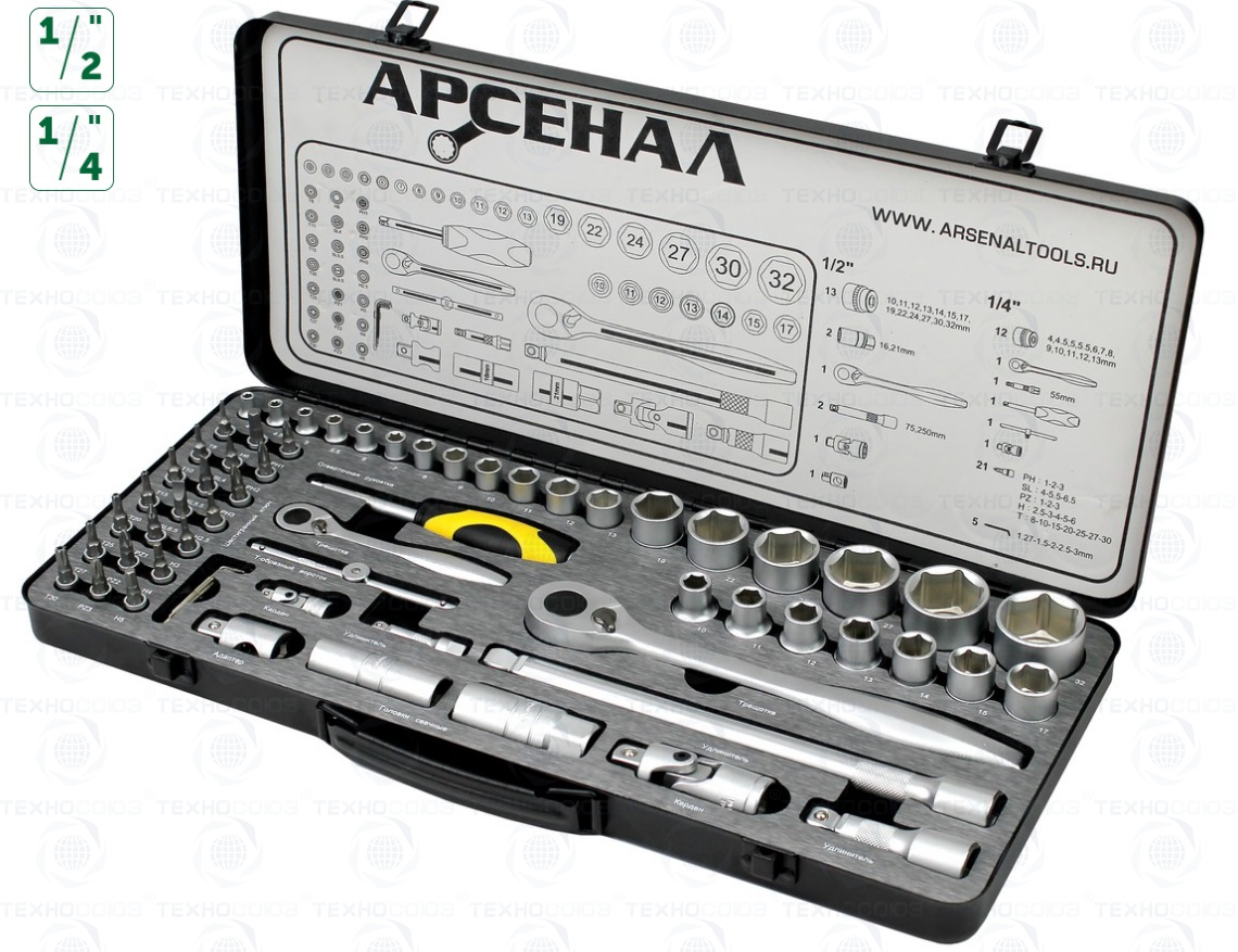 Набор инструментов 63 предмета (М) Арсенал АА-М1412У63 выбор профессионалов для работы дома и обслуживания авто в условиях автосервиса. Хороший подбор головок и бит-вставок. Особо прочная трещотка с металлической рукояткой. Сталь, из которой изготовлен инструмент, легирована хромом и ванадием с нанесением никелевого покрытия. Особо прочный кейс из толстой листовой стали с тройным контуром штамповки. Ламинированные грязе- и маслостойкие ложементы. Наборы инструментов Арсенал имеют пожизненную гарантию. Инструмент Арсенал - Специально разработан для Российских условий!!!