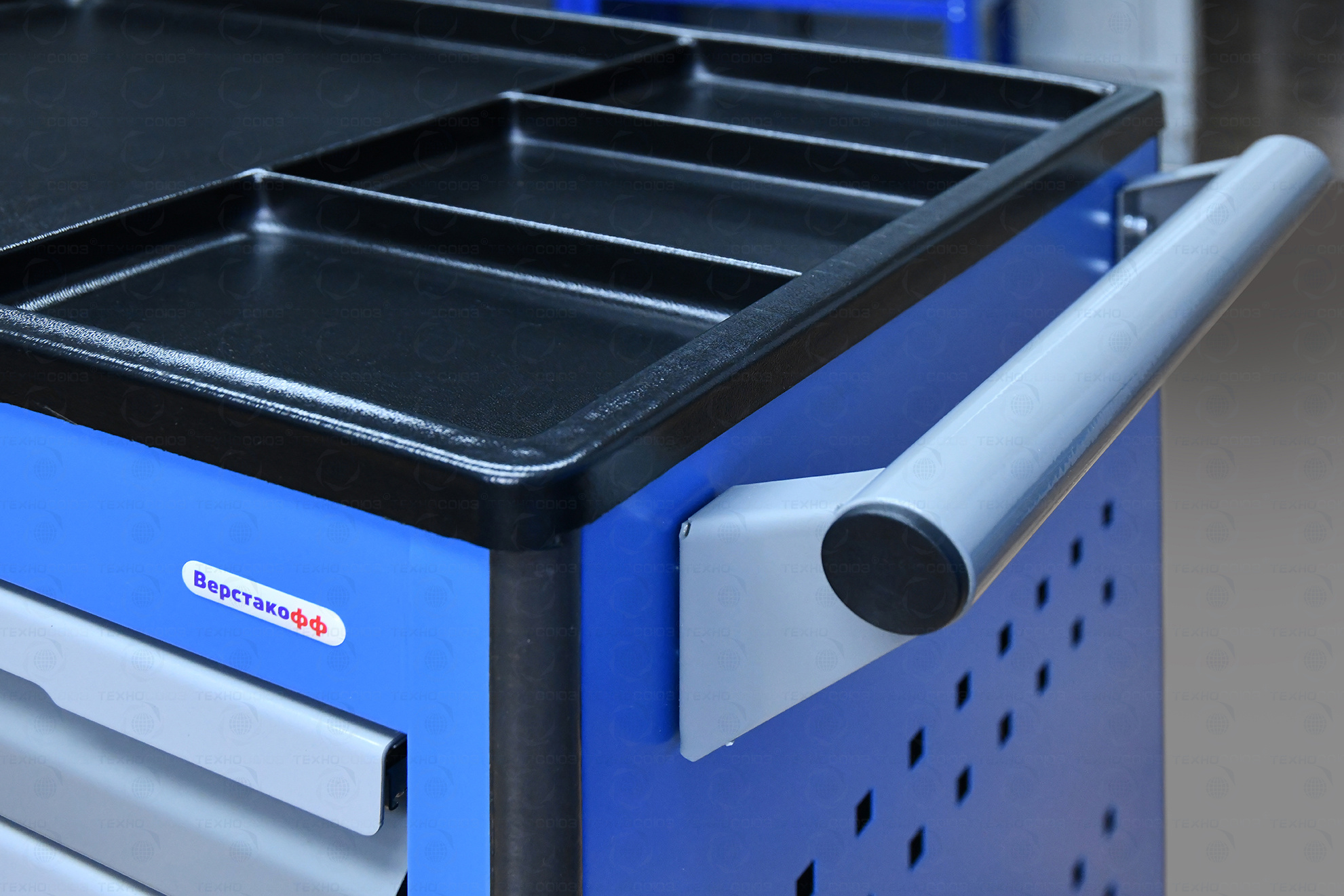 Ящики устанавливаются на шариковых телескопических направляющих полного выдвижения. Обеспечен свободный и плавный ход ящиков даже при полной загрузке. На лицевой панели каждого ящика установлена ручка-накладка. Каждый ящик снабжен клавишной системой антиоткрывания из оцинкованной стали, препятствующей самопроизвольному выдвижению ящиков, например, при наклоне или перемещении тележки.