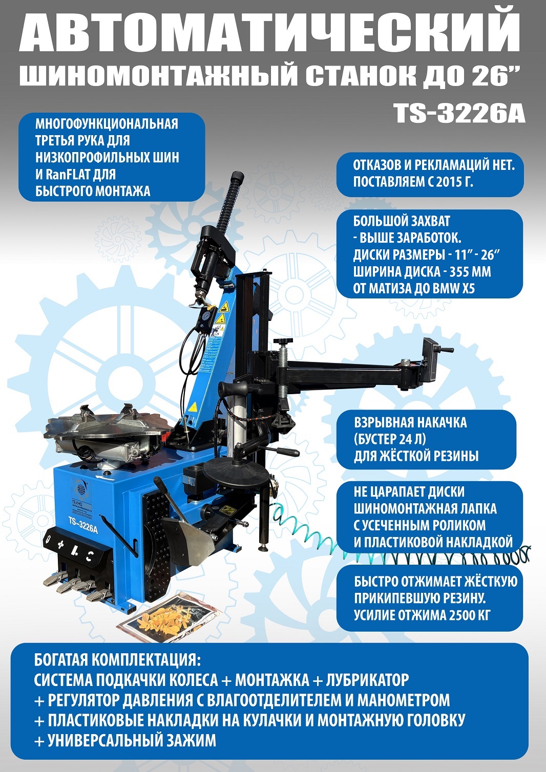 TS-3226A Станок шиномонтажный автоматический до 26". Для больших и широких колес. В комплекте бустер емкостью 24 литра (взрывная подкачка) + третья рука для работы с низкопрофильными шинами и RanFlat. Размеры дисков: снаружи 12÷24", изнутри 14÷26". Максимальное колесо: Ø 990x355 мм. 220/380В. Масса: 256 кг.