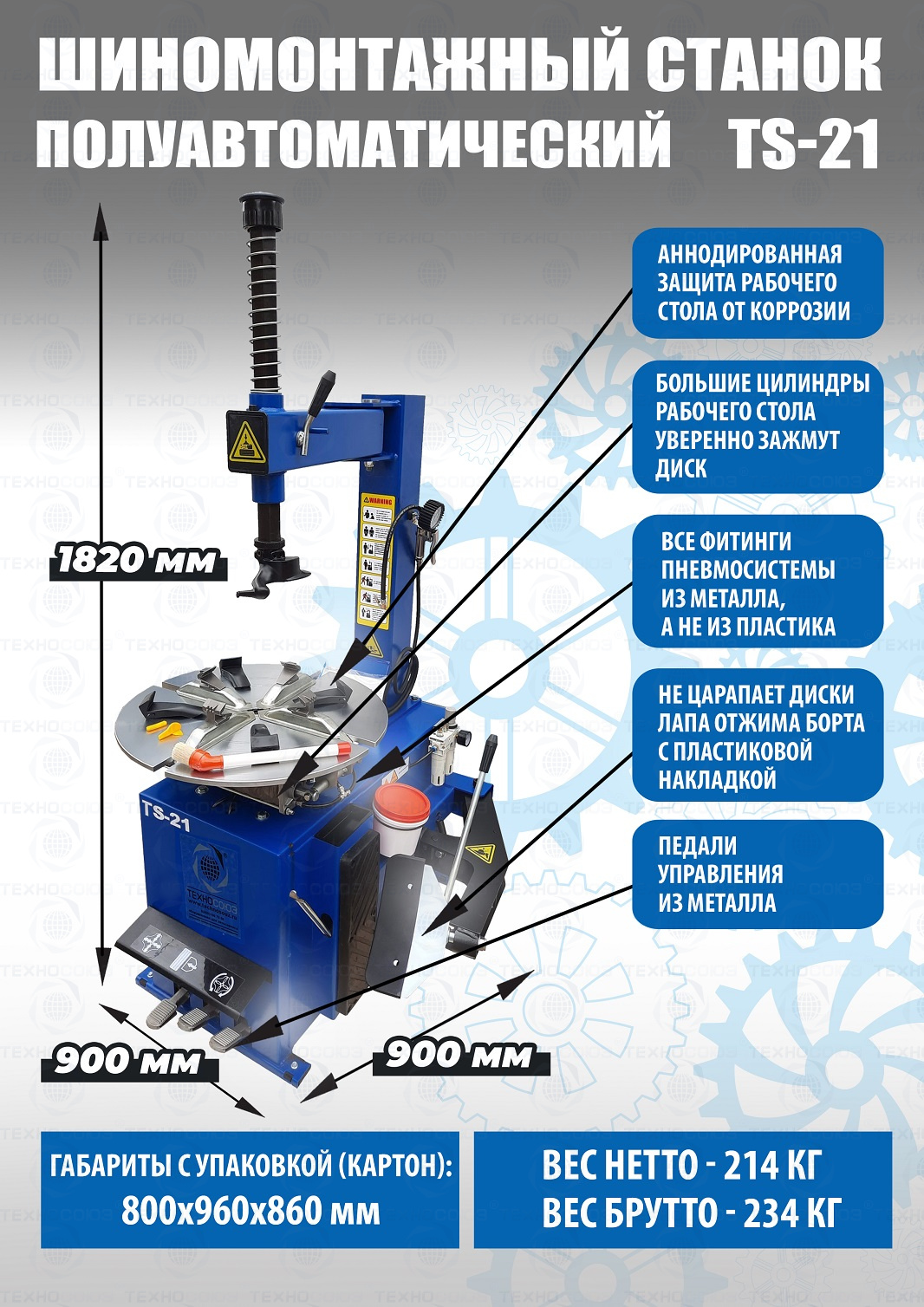 Полуавтоматического шиномонтажного станка TS-21 предназначен для монтажа и демонтажа колес легковых автомобилей, джипов и коммерческой техники. Для дисков: внешний 11÷18”, внутренний 12÷20”. В комплекте: пистолет для подкачки шин + монтажка + пластиковые накладки на зажимные кулачки + регулятор давления с влагоотделителем и манометром. Рекомендуется для постов со средней и высокой проходимостью.