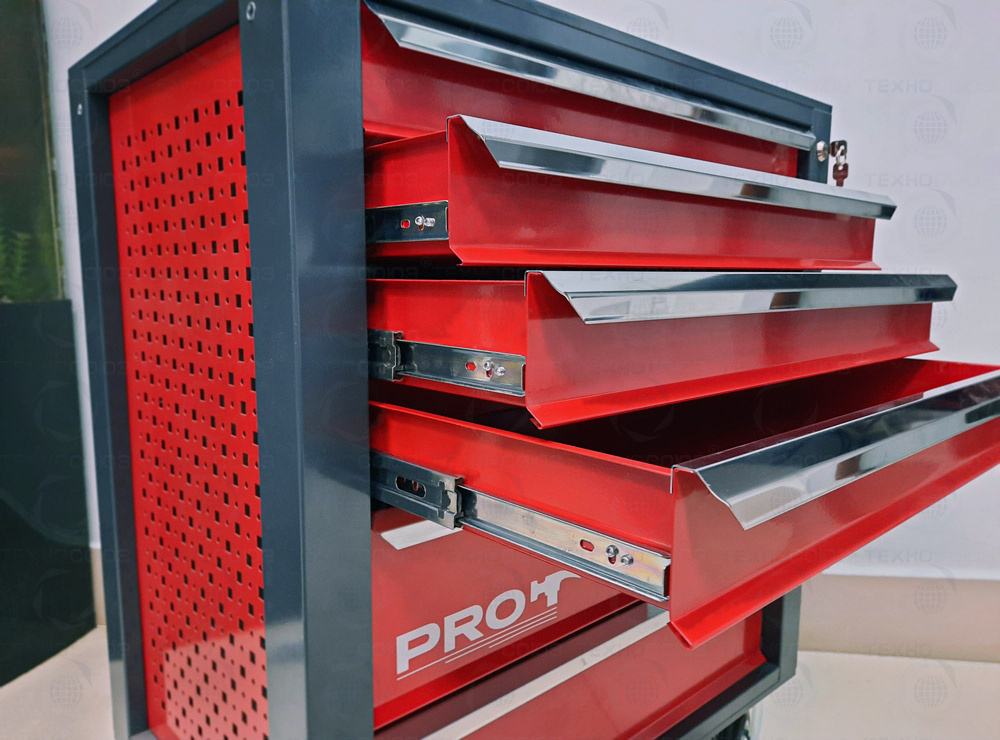 6 ящиков. Для хранения инструмента в ЕВРОЛОЖЕМЕНТАХ. Боковые панели с перфорацией (для установки аксессуаров). Цельносварная конструкция корпуса тележки. Центральный замок Euro-Lock. Шариковые направляющие полного выдвижения. Размеры (высота x ширина x глубина): 850 х 700 х 460 мм. Вес: 58,8 кг.