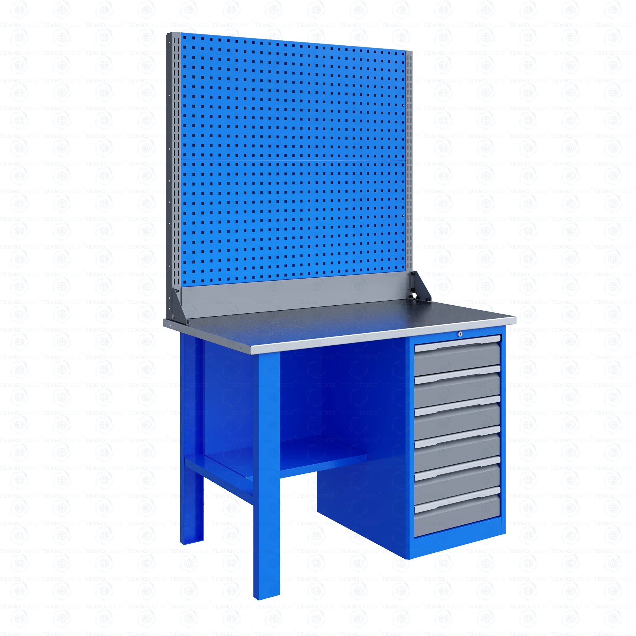 Однотумбовый. Допустимая нагрузка на столешницу 750 кг. Опорные элементы выполнены сварными из холоднокатаной стали. Верстак состоит из столешницы, опоры, тумбы P6 с шестью малыми ящиками, полки-стенки, двойного экрана с кронштейнами. Все металлические элементы покрыты полиэфирной порошковой краской. Столешница состоит из фанеры марки ФСФ толщиной 24 мм, которая покрыта лаком-антисептиком и листом оцинкованной холоднокатаной стали толщиной 1,2 мм. Размеры (ВхШхГ) 1965x1196x696 мм.