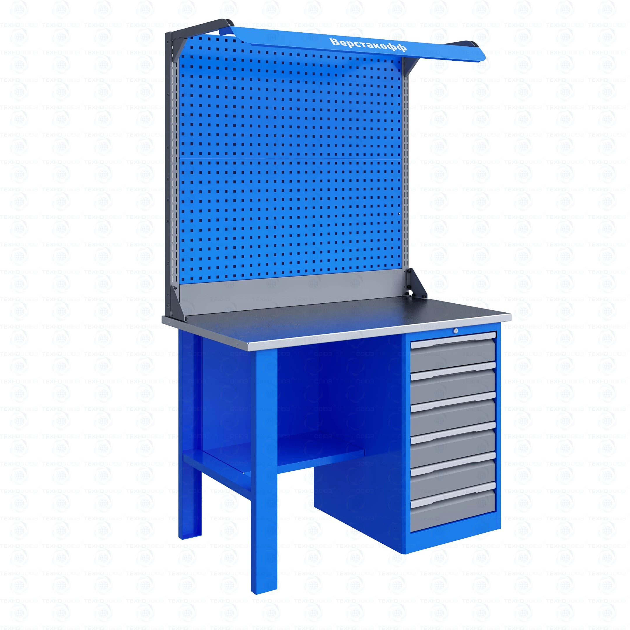 Однотумбовый. Допустимая нагрузка на столешницу 750 кг. Опорные элементы выполнены сварными из холоднокатаной стали. Верстак состоит из столешницы, опоры, тумбы P6 с шестью малыми ящиками, полки-стенки, двойного экрана с кронштейнами и комплекта освещения. Все металлические элементы покрыты полиэфирной порошковой краской. Столешница из фанеры марки ФСФ толщиной 24 мм, которая покрыта лаком-антисептиком и листом оцинкованной холоднокатаной стали толщиной 1,2 мм. Размеры (ВхШхГ) 1965x1196x696 мм.