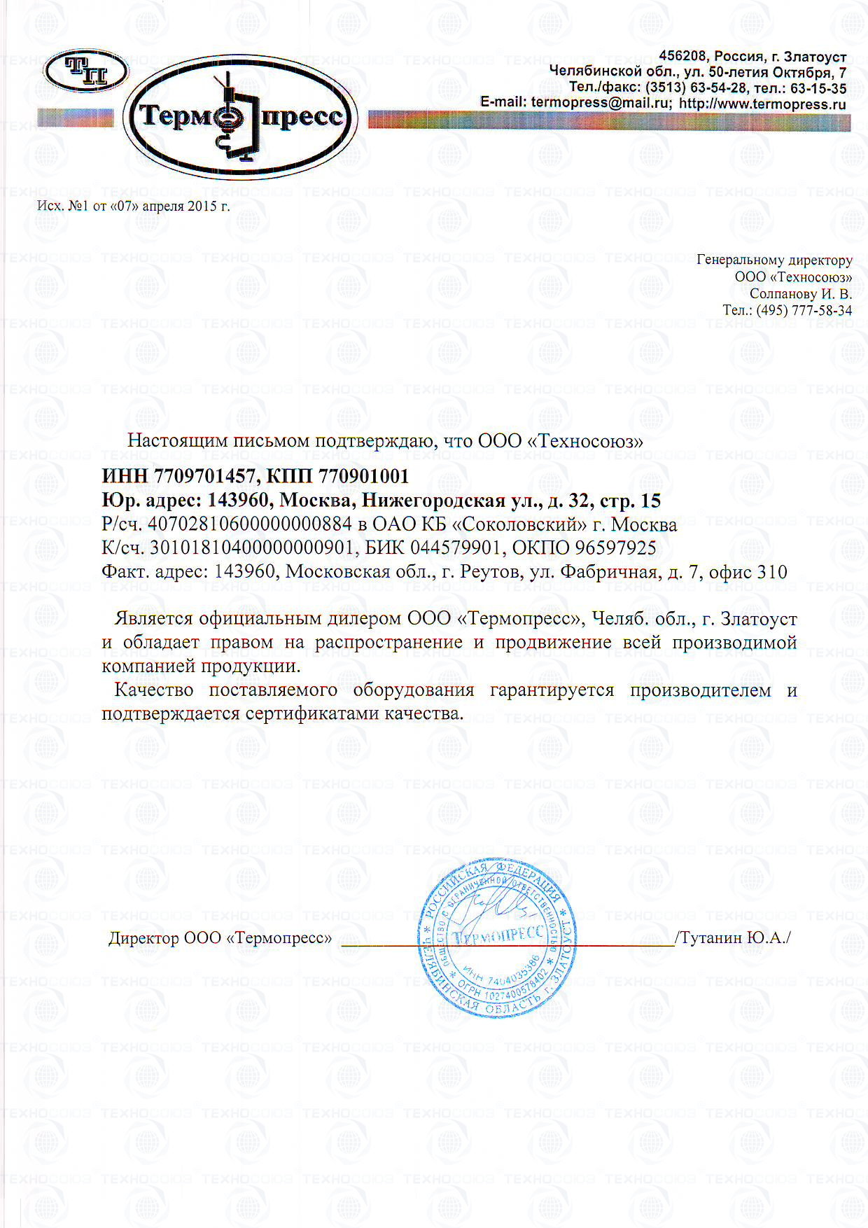 Получатель: Общество с ограниченной ответственностью «Техносоюз»